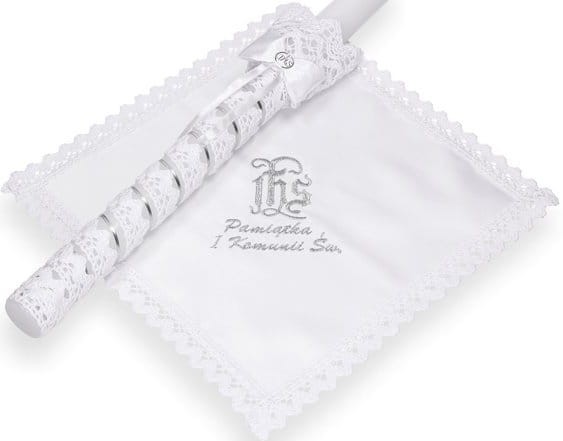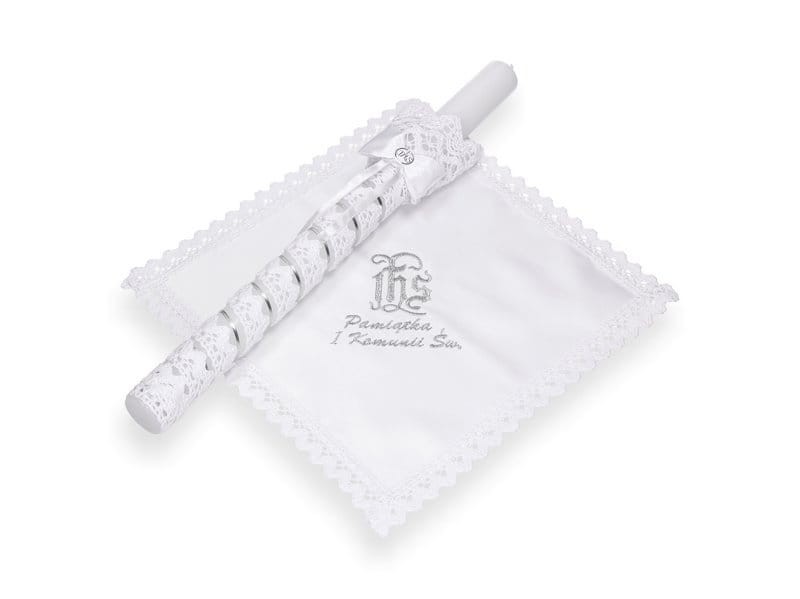 Komplet składa się ze świecy oraz chusteczki. Świeca udekorowana została koronką bawełnianą oraz wstążką atłasową. Okapnik również wykonano z koronki. Chusteczka doskonale pasuje do świecy, obszyta tą samą koronka. Na szatce znajduje się haft do wyboru według wzorów oraz kolorystyka. Całość wraz z okapnikiem materiałowym wygląda elegancko i estetycznie.