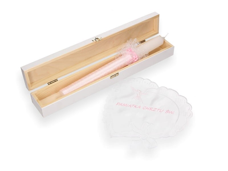 Niezapomniana pamiątka z okazji Sakramentu Chrztu. Świeca ręcznie dekorowana z ozdobnym stroikiem oraz w komplecie z atłasową szatką.