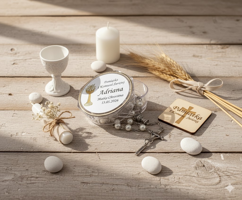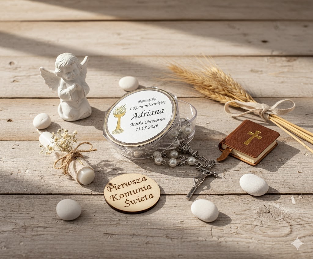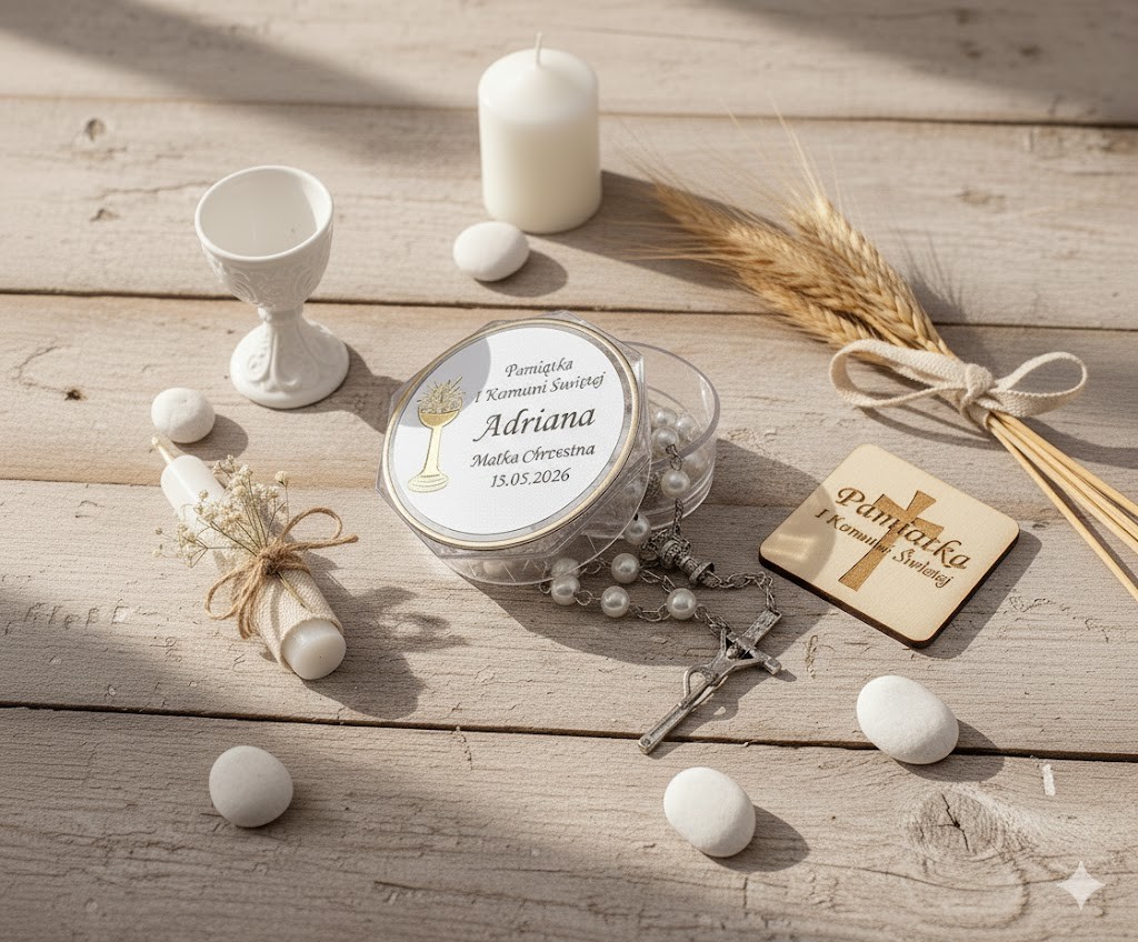 Elegancki zestaw upominkowy, który łączy w sobie piękno tradycji i osobisty charakter. Okrągłe pudełko na różaniec zostało wykończone srebrnym laminatem z możliwością wykonania grawerowanej dedykacji na wieku — imię dziecka, data oraz typ uroczystości (do wyboru: Chrzest Święty, I Komunia Święta lub Bierzmowanie). Dzięki temu prezent zyskuje wyjątkowy, pamiątkowy wymiar, który pozostaje z obdarowanym na długie lata.