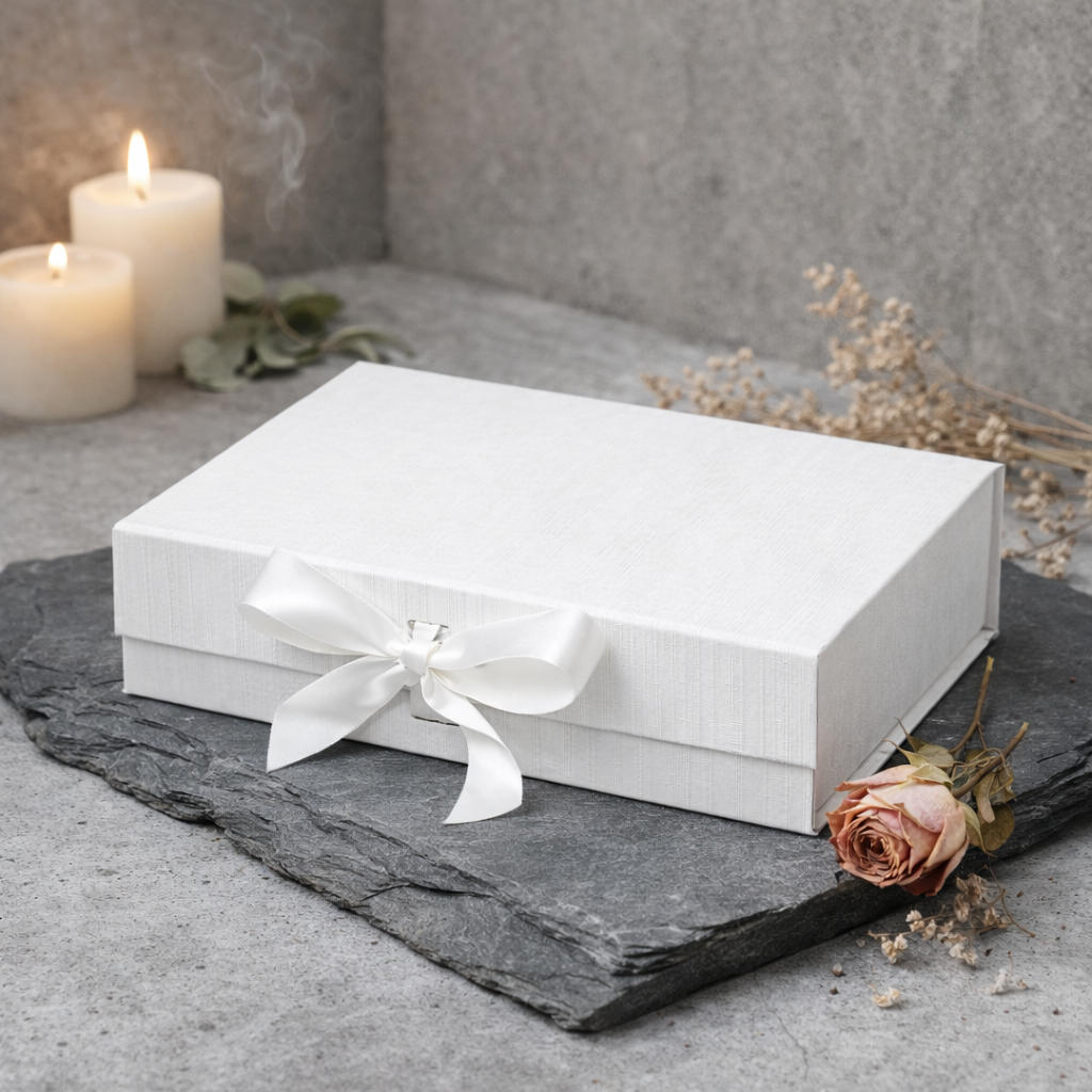 Pudełko magnetyczne A5 białe z wstążką 23,5×17×6 cm – elegancka kasetka prezentowa