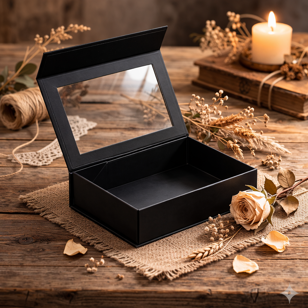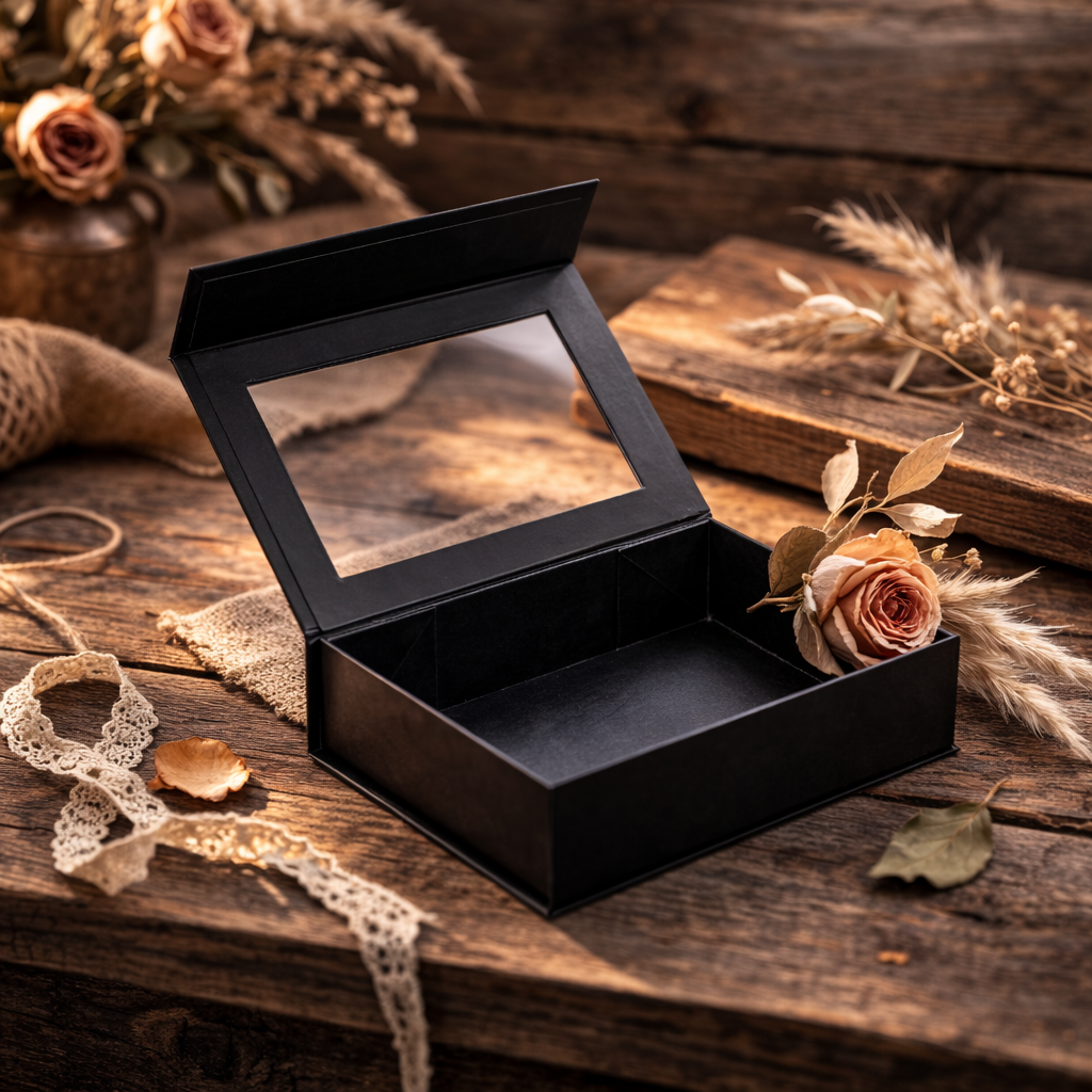 Pudełko magnetyczne B6 czarne z okienkiem 20×15×5,5 cm – kasetka prezentowa
