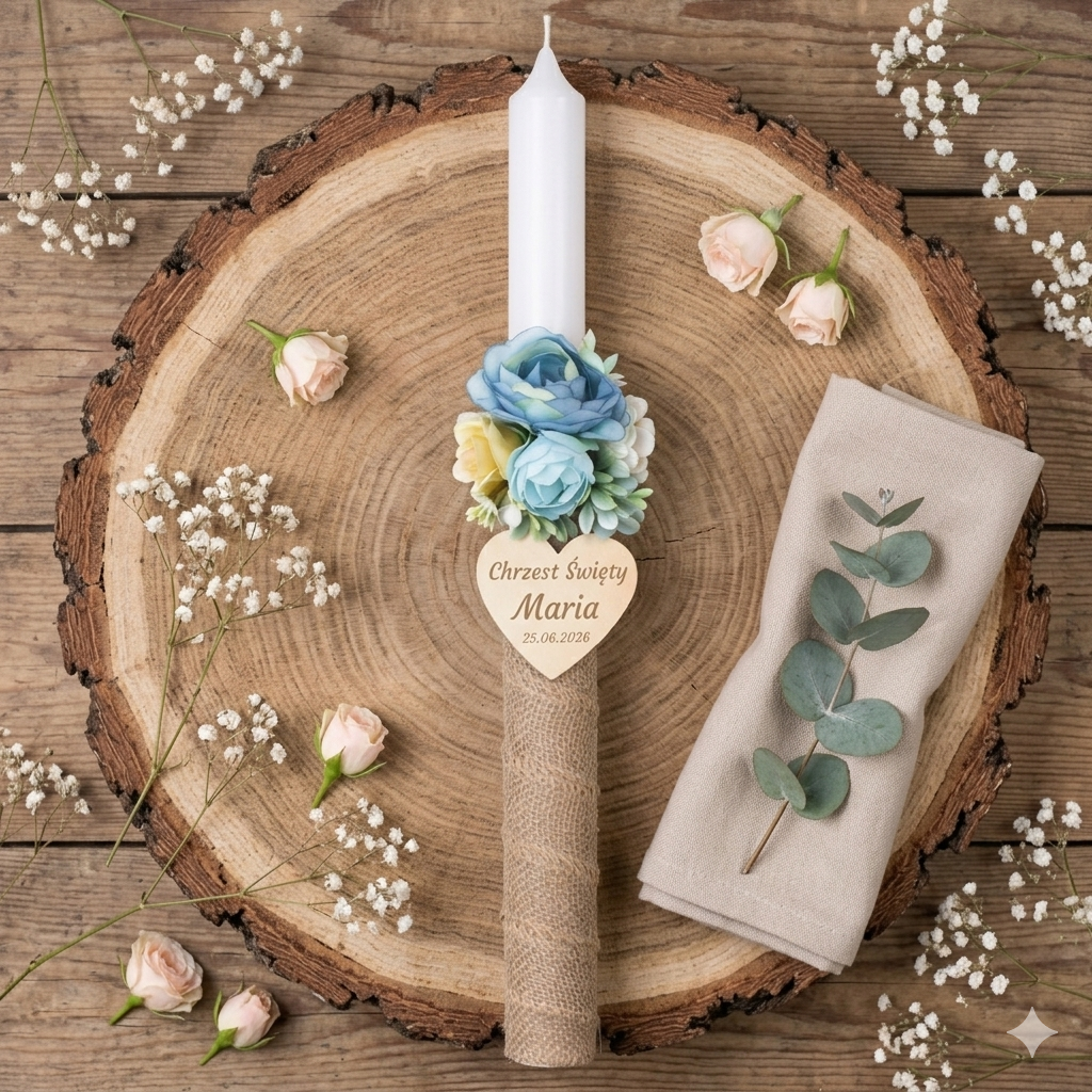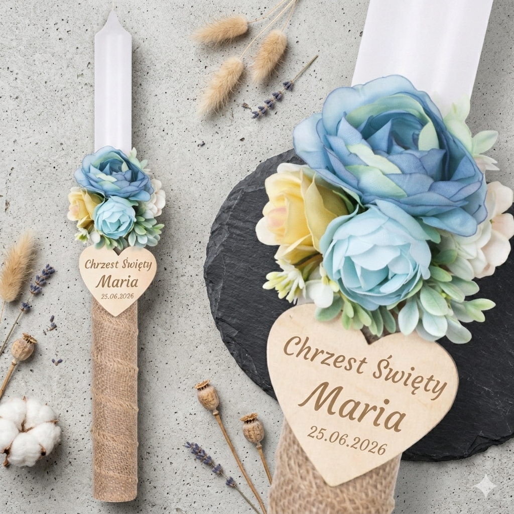 Świeca została ozdobiona jutową wstążką w odcieniu inspirowanym naturą oraz subtelną kompozycją kwiatową. Taka forma dekoracji nadaje jej spokojny, ciepły i autentyczny charakter, który doskonale wpisuje się w uroczystość Chrztu Świętego.