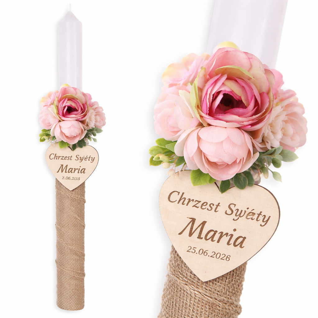 Świeca została wzbogacona o drewniane serduszko z grawerem, na którym można umieścić imię dziecka oraz datę uroczystości. Taka personalizacja sprawia, że świeca staje się unikalną i bardzo osobistą pamiątką.
